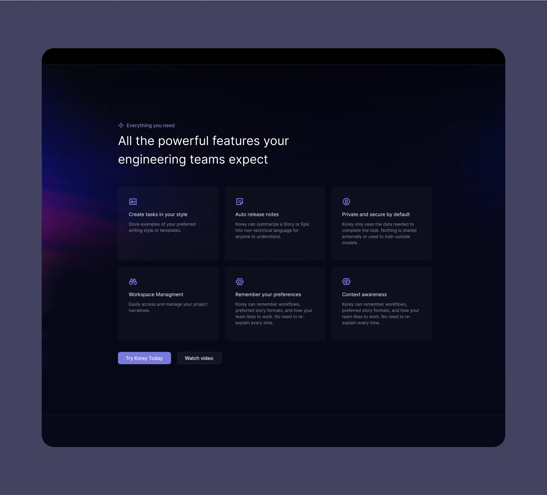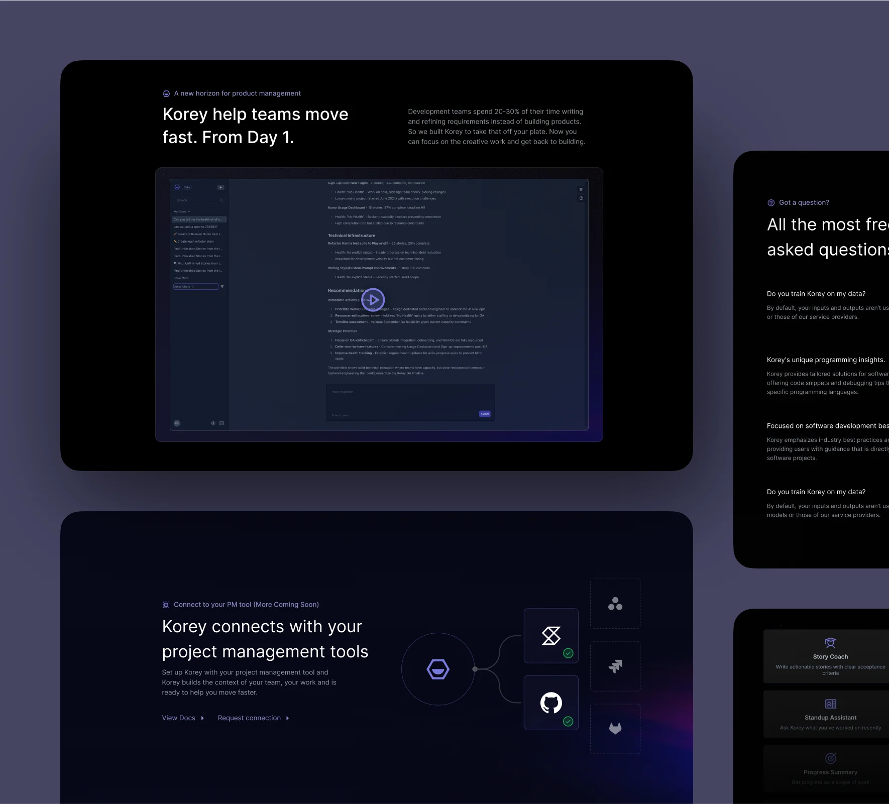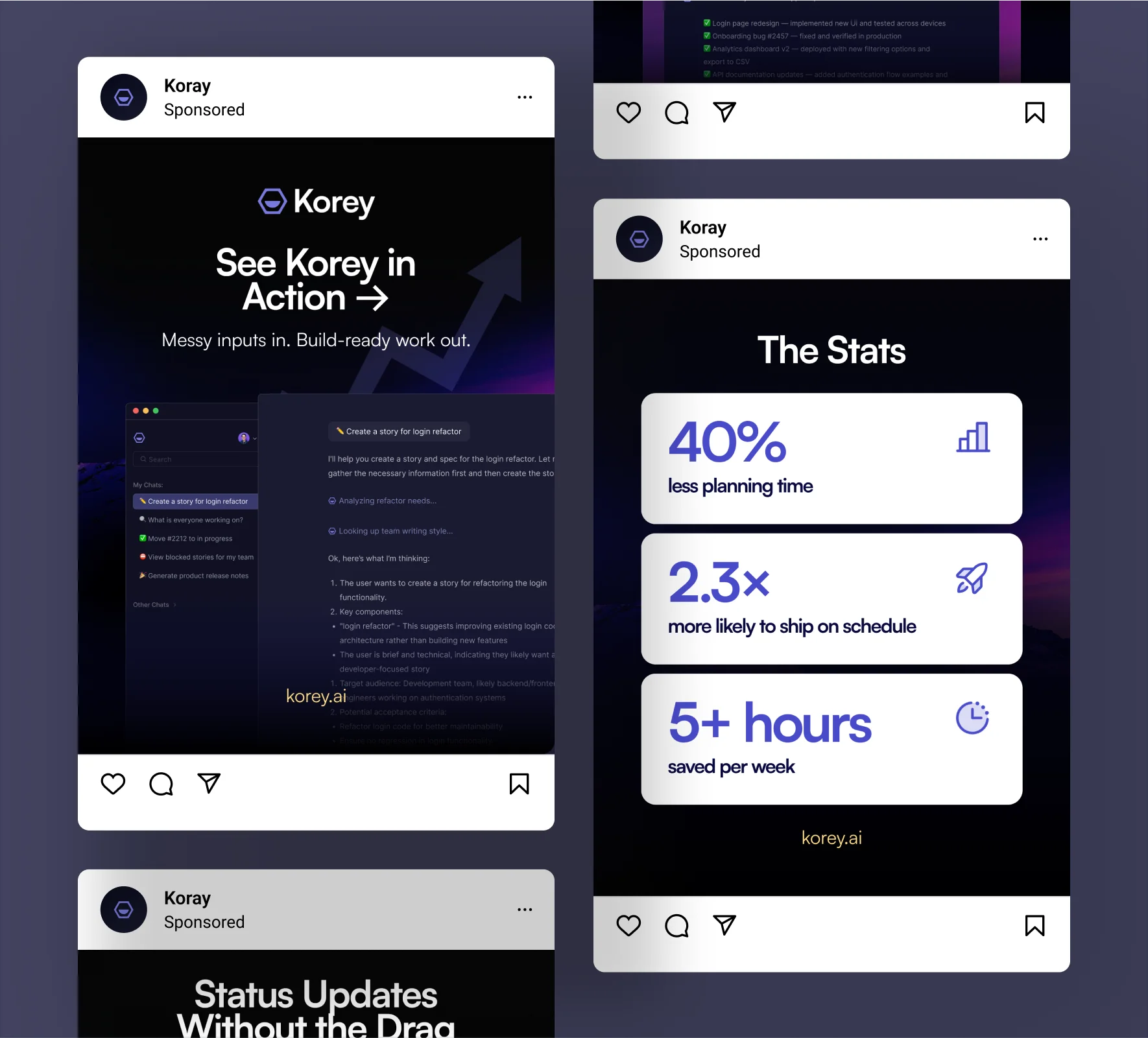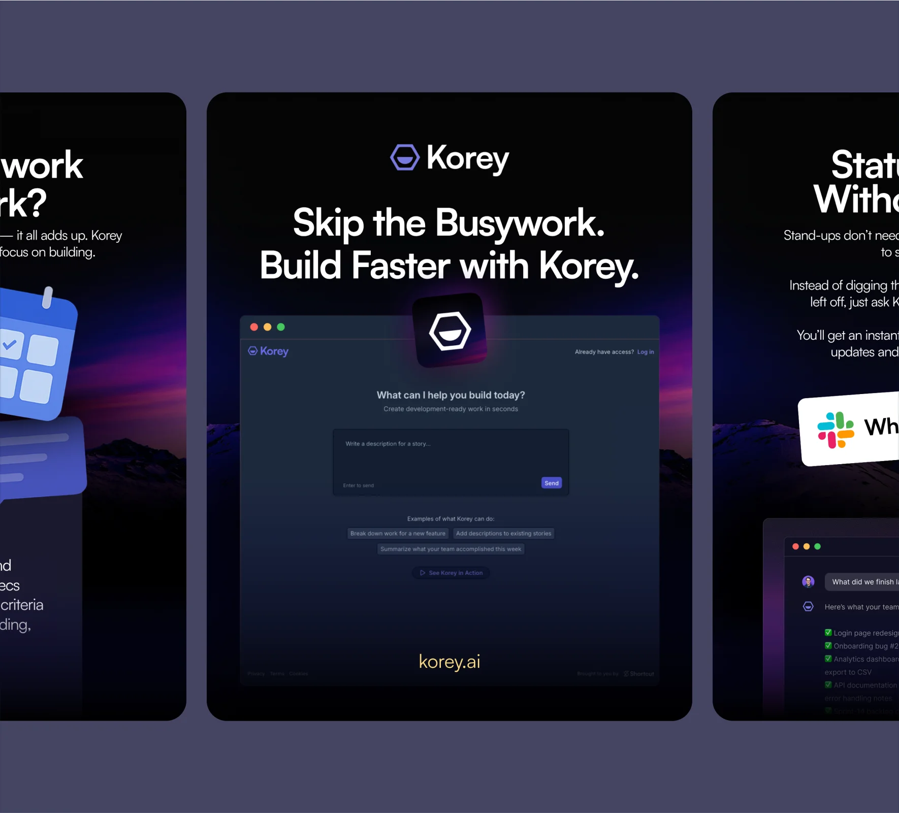 Having long supported Shortcut through our 5Four Unlimited retainer, we were thrilled to help bring their AI-powered product Korey.ai to life. Korey acts as an intelligent project management agent that plugs directly into Shortcut—turning ideas into fully structured Stories, assigning tasks, updating workflows, and surfacing real-time status insights. 5Four handled the web development, aligning closely with Shortcut’s brand and technical standards. We also designed essential marketing collateral, social media assets, and supporting visuals to help introduce Korey to the world. The result: a cohesive and polished digital launch that extended our ongoing partnership and positioned Korey as a seamless extension of the Shortcut platform.