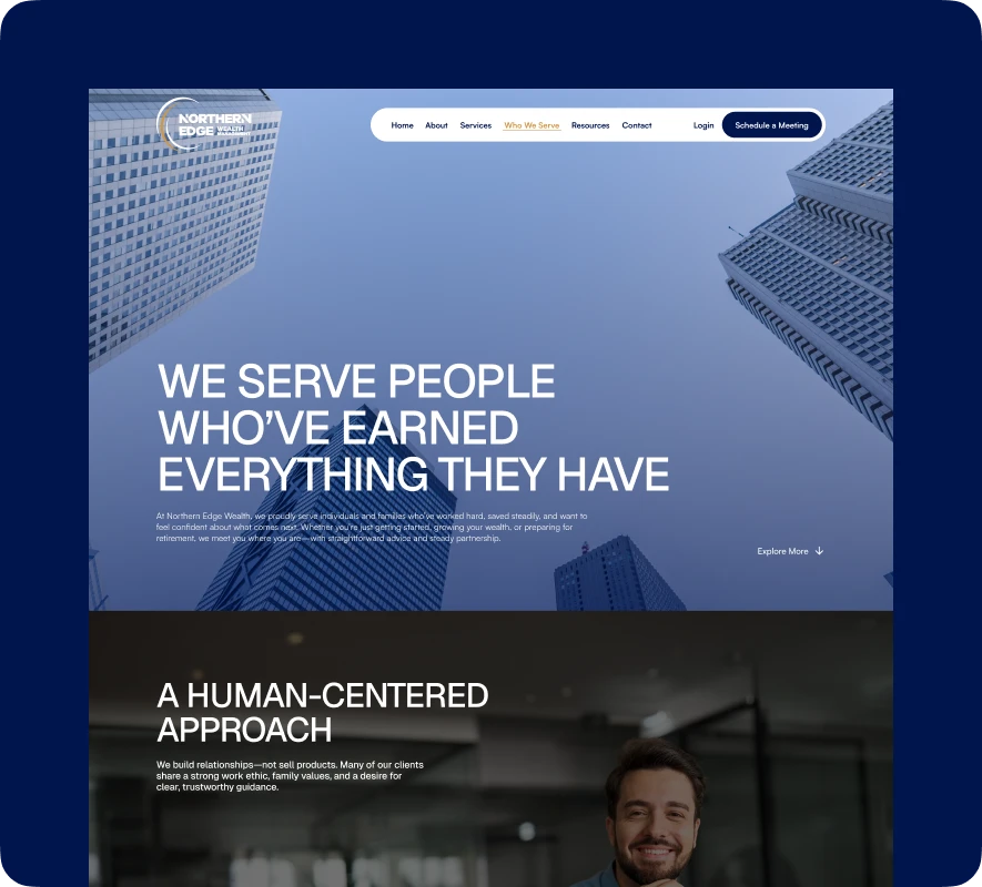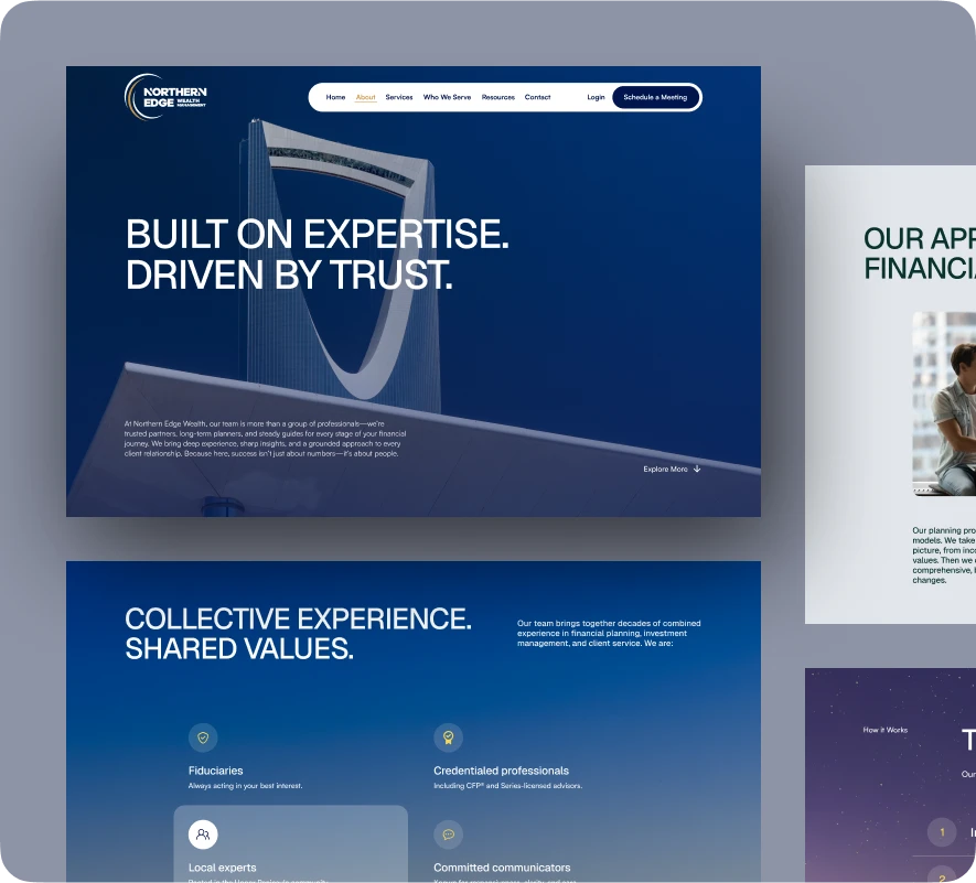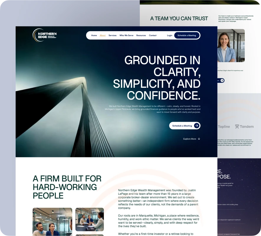 We partnered with Northern Edge Wealth Management to design and develop a modern website that reflects their expertise in investment management, retirement income planning, and financial coordination. We crafted a distinctive online presence built to instill trust and confidence in their working-class and pre-retiree clients. The site incorporates engaging design elements, such as drone video headers, alongside scalable features like a podcast hub and client resources library. With a focus on streamlined navigation, SEO optimization, and long-term scalability, the new platform positions Northern Edge as a trusted guide for clients seeking financial security while reinforcing their mission to empower financial growth.